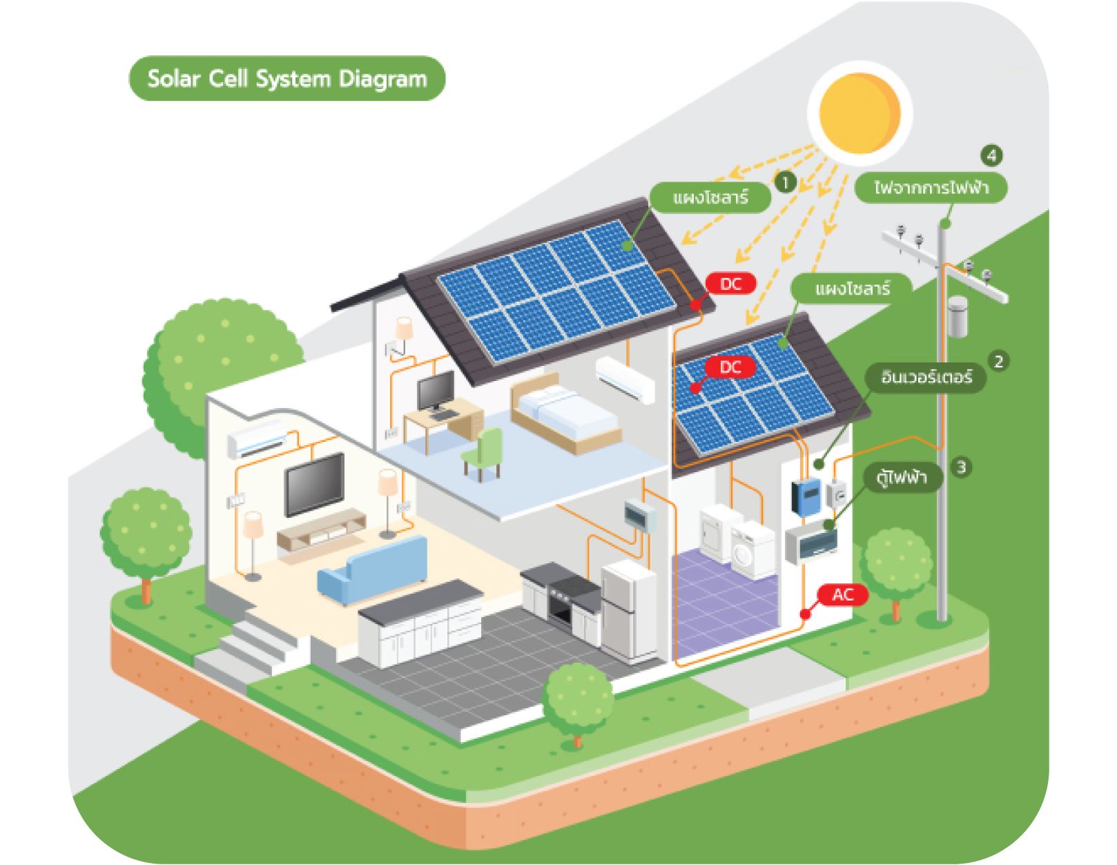 The solar cell system operation will supply electricity to the system together with electricity from the Electricity Authority. By receiving electricity from the electricity meter (4) to the main electrical cabinet (3) in order to distribute electricity to various electrical appliances in the house.