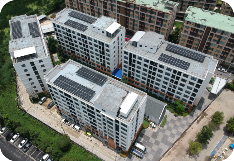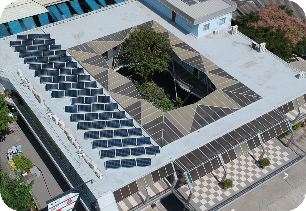 โครงการติดตั้งระบบผลิตไฟฟ้าพลังงานแสงอาทิตย์บนหลังคาของอาคารต่างๆ รวมถึงหลังคาของโรงงาน โดยมีขนาดกำลังการผลิตติดตั้ง ตั้งแต่ 3 กิโลวัตต์ จนถึงมากกว่า 1 เมกกะวัตต์ ซึ่งจะคำนึงถึงความเหมาะสมของพื้นที่หลังคาและสภาพแวดล้อม ณ บริเวณนั้นๆ และอุปกรณ์ต่างๆ ที่บริษัทเลือกใช้ เช่น แผ่นโซลาร์ และอินเวอร์เตอร์ จะเลือกจากผู้ผลิตที่มีชื่อเสียงและเป็นที่ยอมรับกันทั่วโลกในเรื่องของคุณภาพ ความคงทน และประสิทธิภาพ